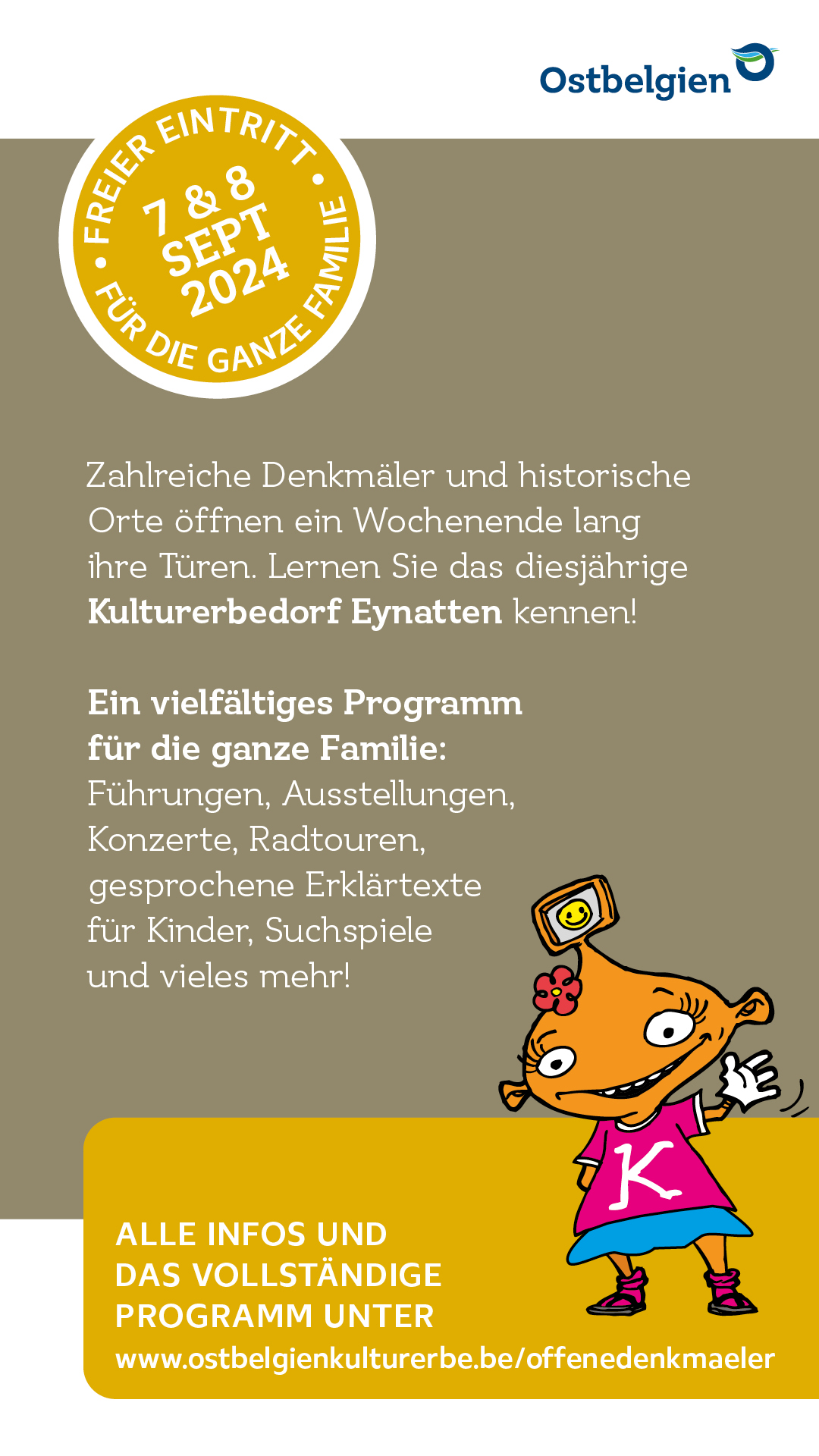 Nutzen Sie die Chance und erleben Sie die spannende Geschichte von Kelmis kostenfrei: Anlässlich der Tage des offenen Denkmals können Sie kostenlos die Dauerausstellung des Museum Vieille Montagne im denkmalgeschützten und einzigartigen Direktionsgebäude der Vieille Montagne besuchen. Das gesamte Museum ist barrierefrei, verfügt über Stellplätze auf der Rückseite, mobile Stühle und einen Aufzug.